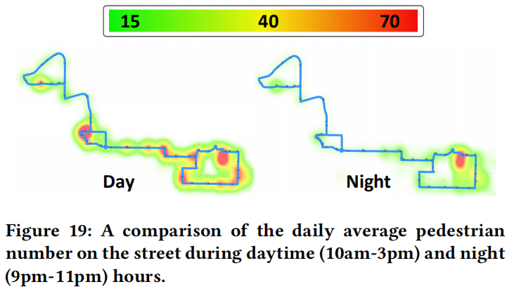 从上述图,我们可以了解到时间因素的影响。在一天的不同时间,行人的活动是不一样的。当然根据不同的地区会有不同的行人热量图。