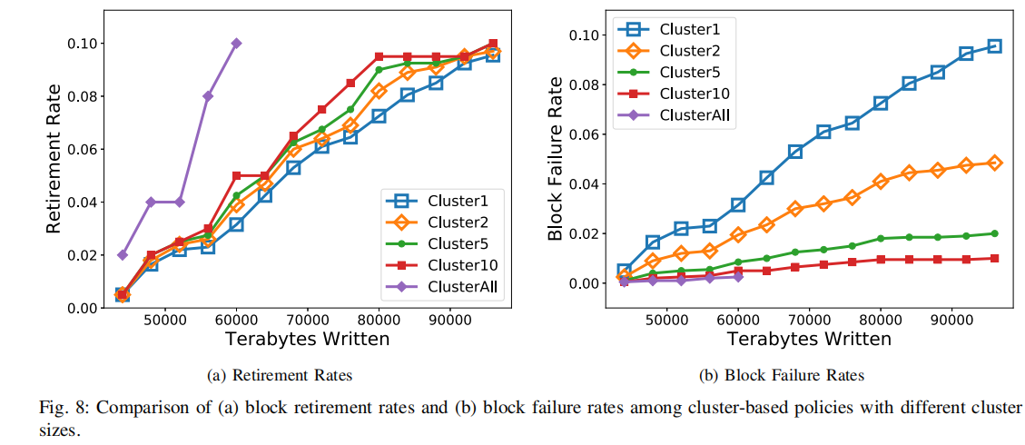 图8展示了块退休率和块故障率随时间变化趋势。评估了五种不同的集群大小,包括1、2、5、10,以及clusterAll表示同一芯片内的所有块视为单个集群。注意,cluster1相当于BlockNoLimit,clusterALL代表集群很大。