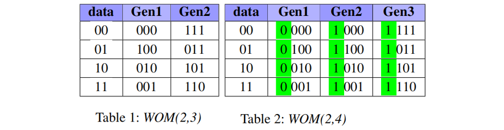 Binary-WOM应用于较早的存储设备上,例如Punch Card。在这类介质上,数据以位为粒度写入,并且一旦写入,位只能在一个方向上更改。例如,只能从比特0变换到比特1。表1和表2给出的是WOM(2,3)和WOM(2,4),对于WOM(2,3),表示数据存储两位,但实际存储三位。可以看作底层是TLC闪存,抽象出MLC闪存。对于每个TLC页面,可以编程两次(两代)。第一代和第二代中的比特位是TLC三位组成的8种形式。因此,通过这种方式,两次编程后,实际写入的数据为2+2=4bits,比TLC的3bits要多。