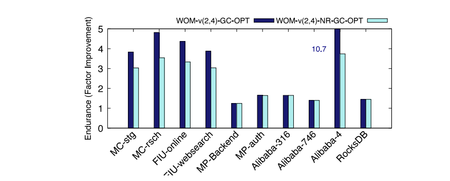 我们观察到,对于相同的写模式,WOM-QLC设备的耐久性在所有情况下都超过了MLC设备的耐久性(比率大于1)。即使对于具有更高垃圾回收的工作负载,来自WOM代码的改进也低于其他工作负载。平均而言,GC_OPT模式的耐力提高了3.5倍,GC_OPT-NR模式提高了2.4倍。